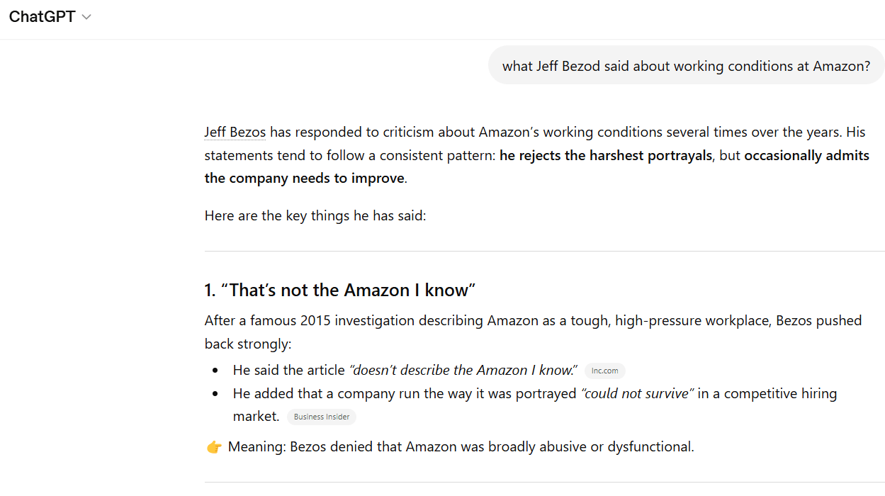 AI-generated outputs aim to present as complete a picture as possible of a brand’s, company’s, or individual’s public perception. Responses may include not only undesirable information, but also rebuttals, critiques, or commentary. The presence of such content demonstrates that even when issues arise, they are not being ignored and efforts are being made to address them. This is illustrated in the screenshot below.
